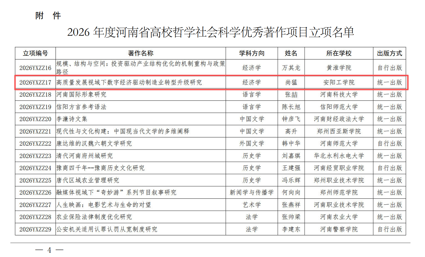 近日,中共河南省委教育工作委员会、河南省教育厅公布了2026年度河南省高校哲学社会科学优秀著作资助项目立项计划。我院教师尚猛、贾纯洁等老师的研究成果《高质量发展视域下数字经济驱动制造业转型升级研究》入选资助名单。